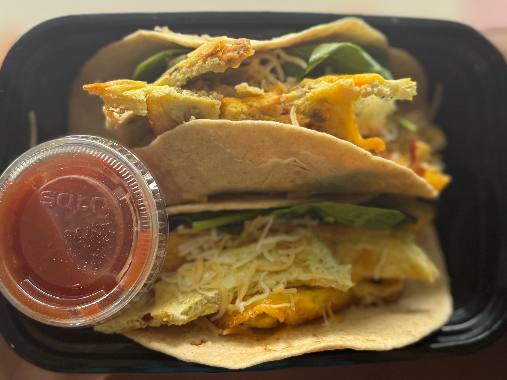 3 local cage free scrambled eggs, spinach and crumbled chicken sausage between 2 whole wheat tortillas topped with mexican shredded cheese served with a side of salsa.