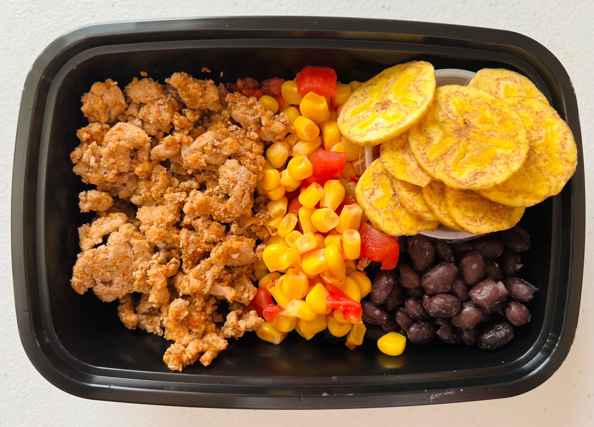Ground taco turkey with a side of mexican corn, black beans & plantain chips with salsa.