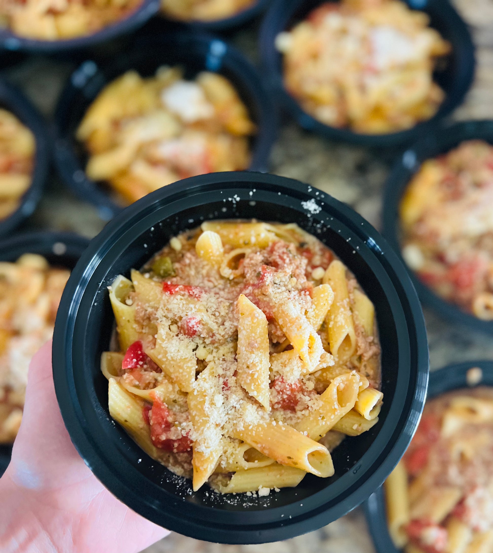 Gluten free penne noodles with ground turkey mixed with basil pesto & mozzarella.